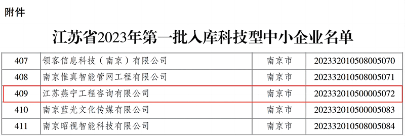 近期,江蘇省科技廳下發(fā)《江蘇省科技廳關(guān)于2023年第一批入庫科技型中小企業(yè)的公告》,江蘇燕寧工程咨詢(xún)有限公司自2021年起第三次成功入選。 科技型中小企業(yè)是指依托一定數量的科技人員從事科學(xué)技術(shù)研...
