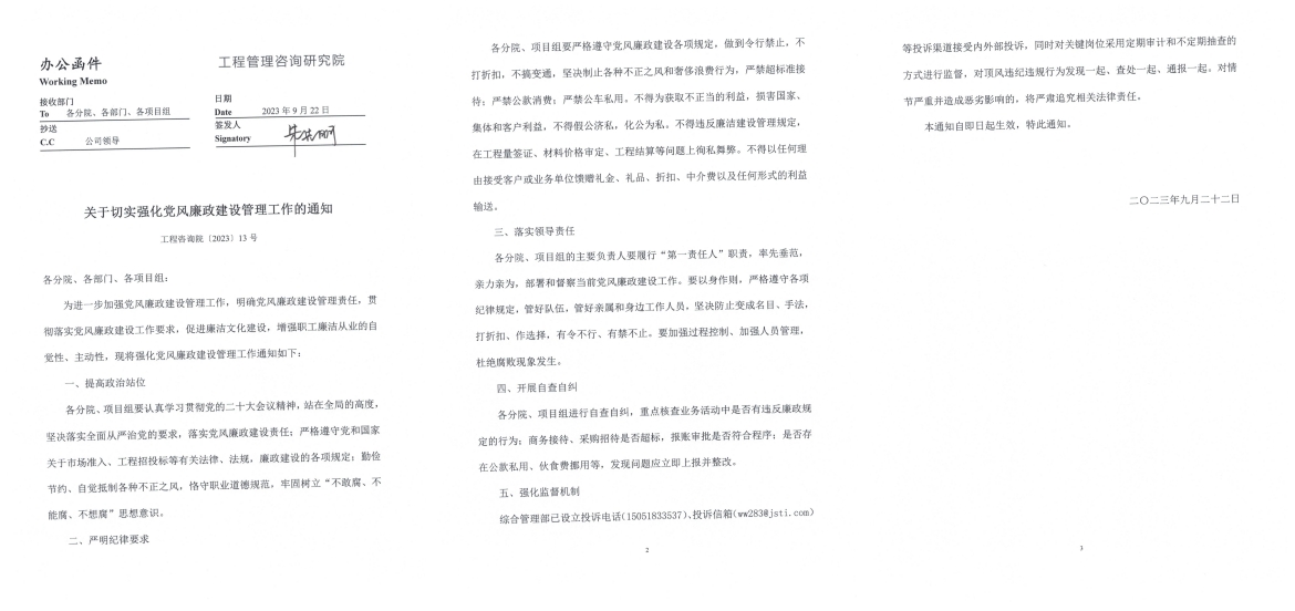 11月29日,為深入推進(jìn)中共蘇交科集團第六黨支部、蘇交科集團股份有限公司工程管理咨詢(xún)研究院(以下簡(jiǎn)稱(chēng)工程咨詢(xún)院)黨風(fēng)廉政建設管理工作,貫徹落實(shí)中央、省及集團黨風(fēng)廉政建設工作要求,持續深化廉政文化建設,增強員工廉潔從業(yè)的自覺(jué)性、主動(dòng)性,工程咨詢(xún)院組織召開(kāi)了全院黨風(fēng)廉政建設專(zhuān)題培訓會(huì ),在會(huì )上對工程咨詢(xún)院2023年9月22日發(fā)布的13號文《關(guān)于切實(shí)加強黨風(fēng)廉政建設管理工作的通知》進(jìn)行再宣貫、再落實(shí),工程咨詢(xún)院院長(cháng)兼黨支部書(shū)記朱先明同志要求以各分院為單位,全面開(kāi)展一次廉政自查自糾活動(dòng),夯實(shí)工程咨詢(xún)院廉政工作基石。